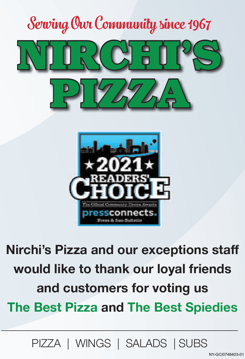 Please check with each Nirchi’s Pizza location for their takeout, delivery, online and indoor and/or outdoor dining options. The Nirchi’s owners and staff would like to express our gratitude to all our loyal customers and friends for all your support since 1967.